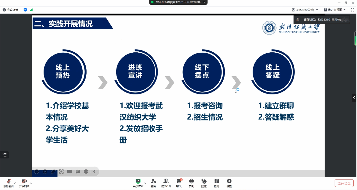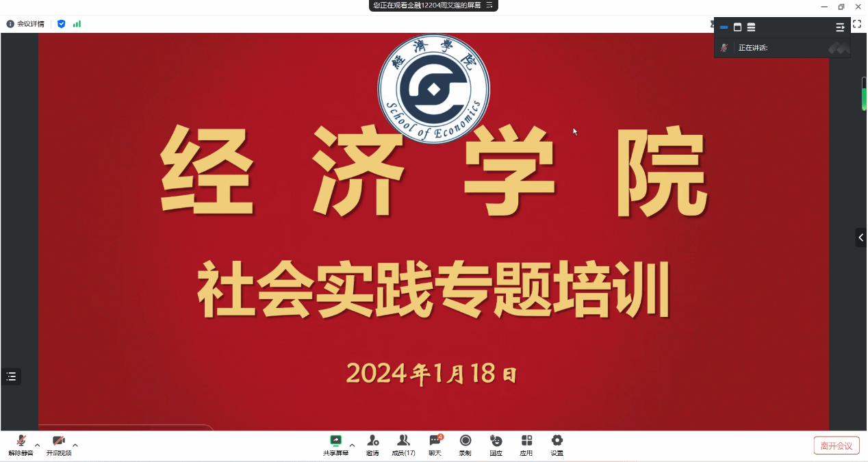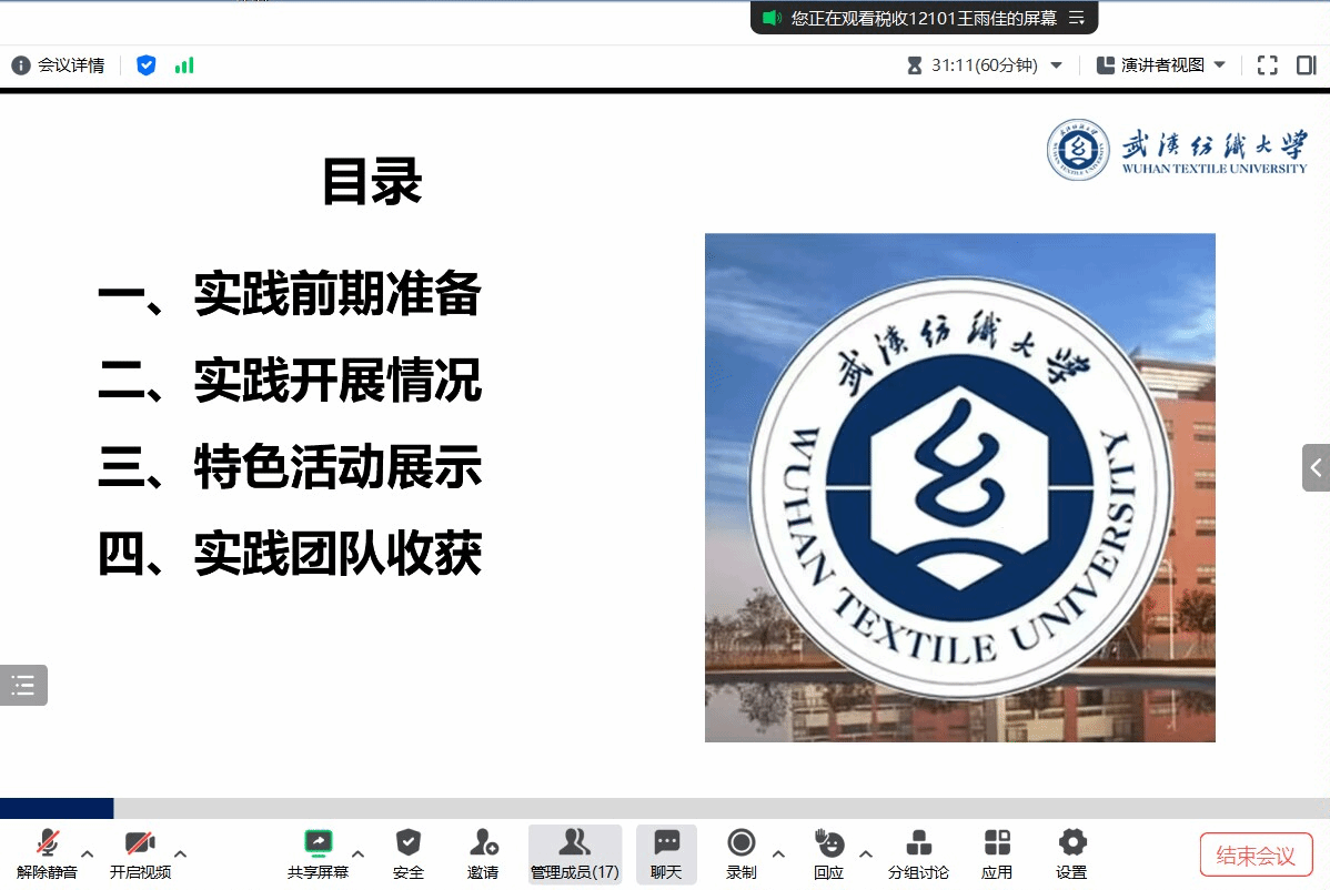 为确保本次“最美纺大带回母校”寒假社会实践活动顺利开展,使其充分发挥社会实践育人作用,学院于1月18日晚,在线上开展交流培训会。本次培训会特邀第五届“最美纺大带回母校”活动一等奖获得者王雨佳进行经验分享,并对本次获得学院立项的10支队伍负责人进行指导培训和答疑解惑。
